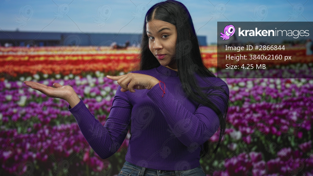 Smiling latin woman shows ok sign with hand held above open palm among colorful tulip flowers by building; approval joy.