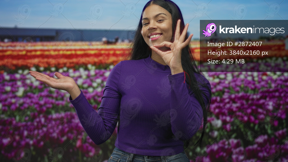Smiling latin woman shows ok sign with hand held above open palm among colorful tulip flowers by building; approval joy.