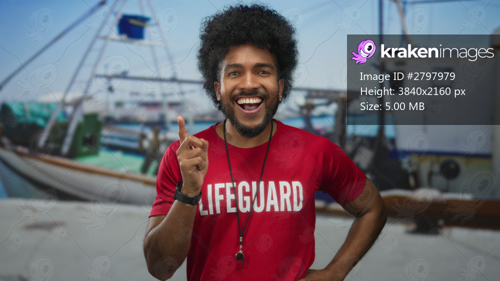 Smiling lifeguard man with beard stands confidently by the seaside port as boats dock, exuding positive energy and readiness in his red uniform against a sunny outdoor backdrop. - Kraken Images