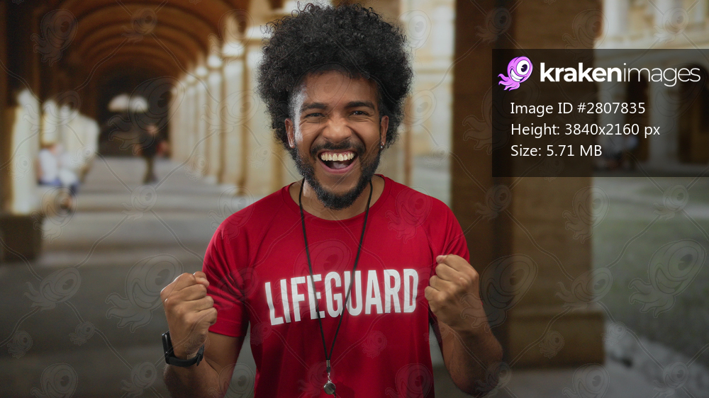 Smiling lifeguard man stands joyfully in an old university courtyard, expressing happiness and energy with clenched fists surrounded by historic architecture. - Kraken Images
