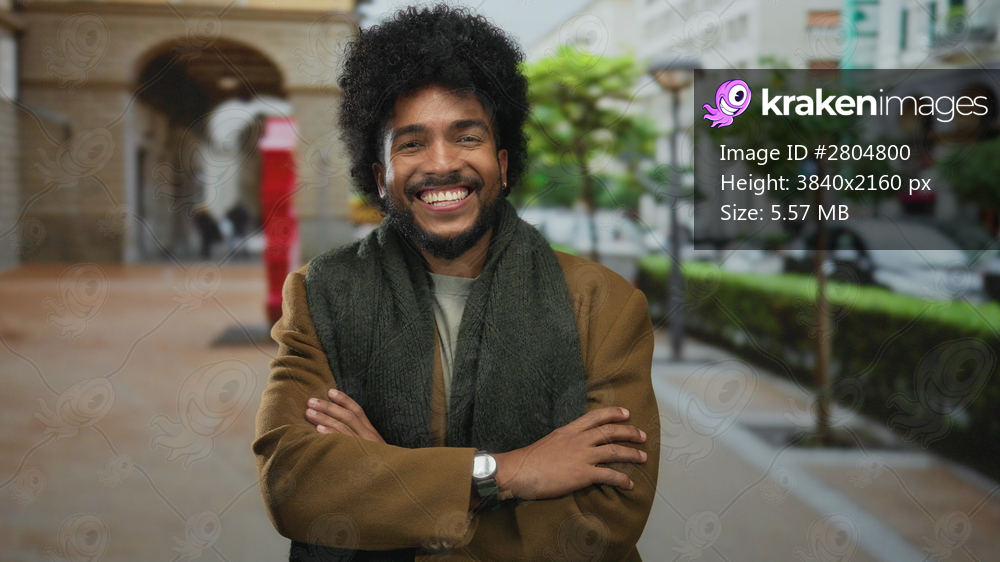 Smiling man with arms crossed stands joyfully on a city street surrounded by urban architecture and greenery.