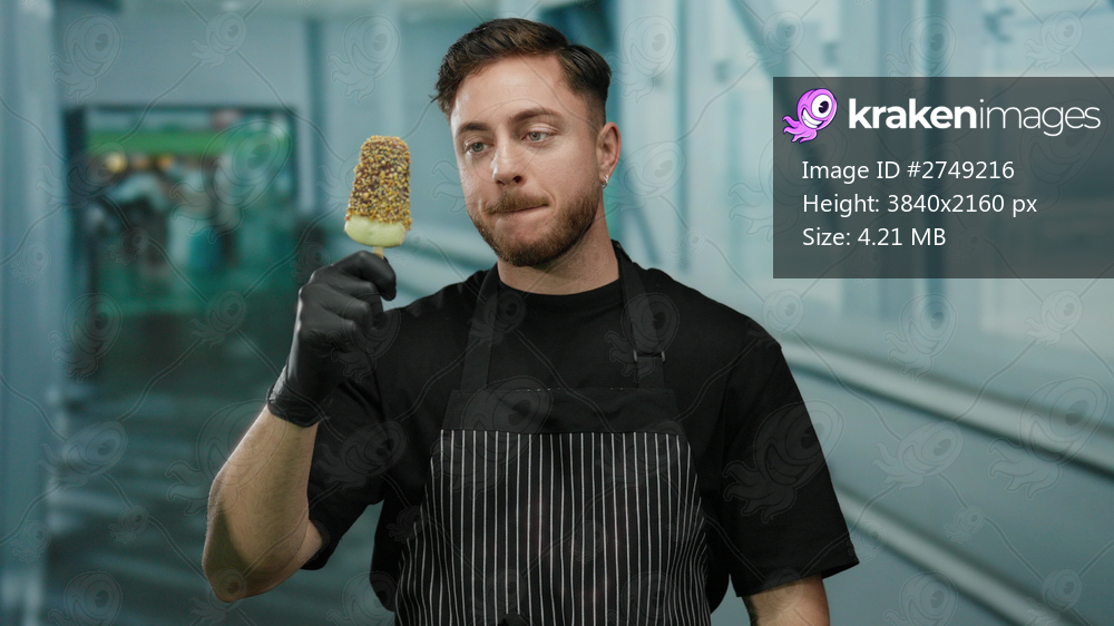 Smiling man with beard and apron holds ice cream bar in airport terminal highlighting food service in travel environment
