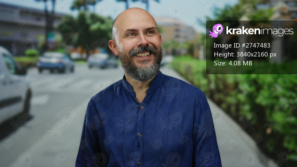 Smiling man with beard and blue shirt stands outdoors on urban street with trees and cars in background on a sunny day showing a casual vibe