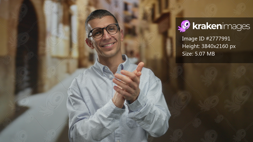 Smiling man clapping on a cobblestone street with blurred cityscape in background, embodying happiness and success outdoors in daylight.
