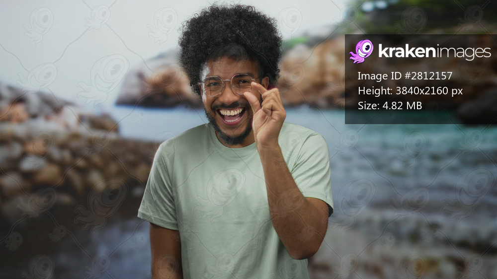 Smiling man with curly hair in glasses making small gesture at seaside with rocks and ocean in background.