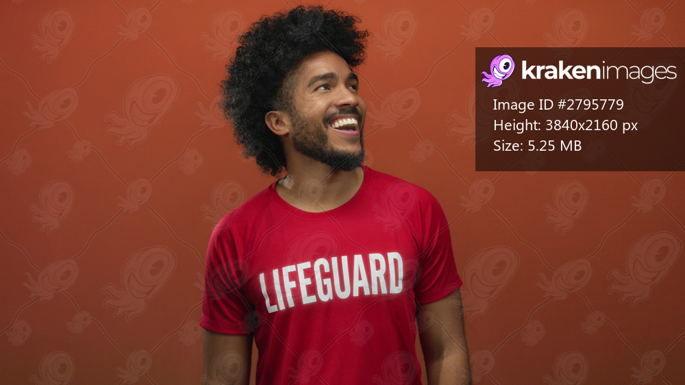 Smiling man with curly hair wears red lifeguard shirt against isolated red wall background, expressing happiness and joyful emotion.