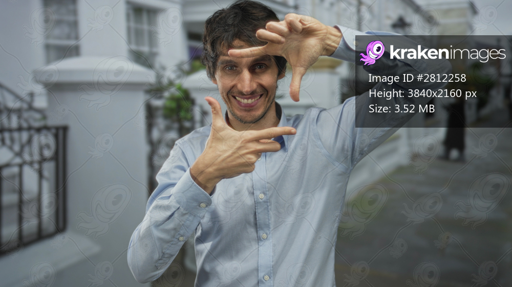 Smiling man framing with hands in front of white townhouses on city street; creativity imagination optimism vision.