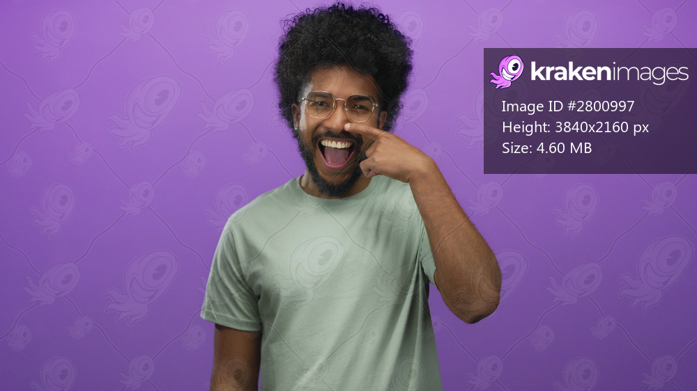 Smiling man with glasses pointing at his nose poses against a vibrant purple background, conveying a playful and confident mood in an isolated studio setting. - Kraken Images