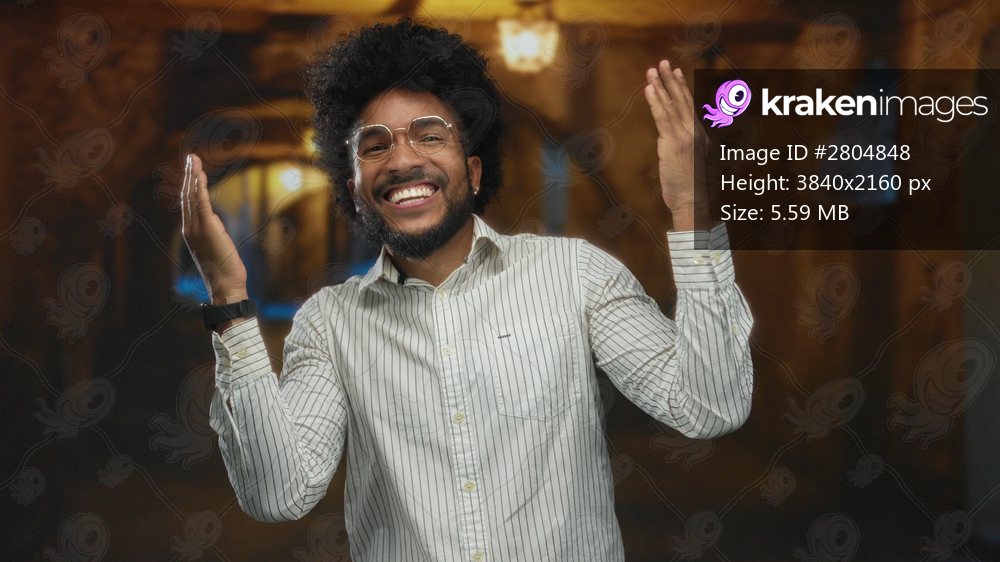 Smiling man with glasses stands in an illuminated tunnel, showcasing a joyful expression outdoors in a casual striped shirt.
