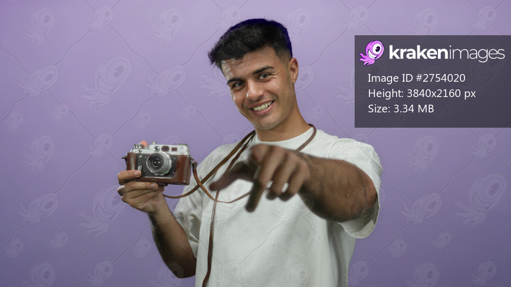 Smiling man holding vintage camera points towards viewer against purple background showcasing youthful enthusiasm and creativity