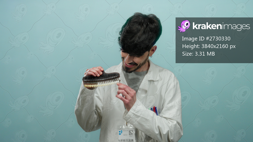 Smiling man holds dental shade guide wearing lab coat against blue background showcasing dentistry with pens in pocket highlighting expertise and professionalism - Kraken Images
