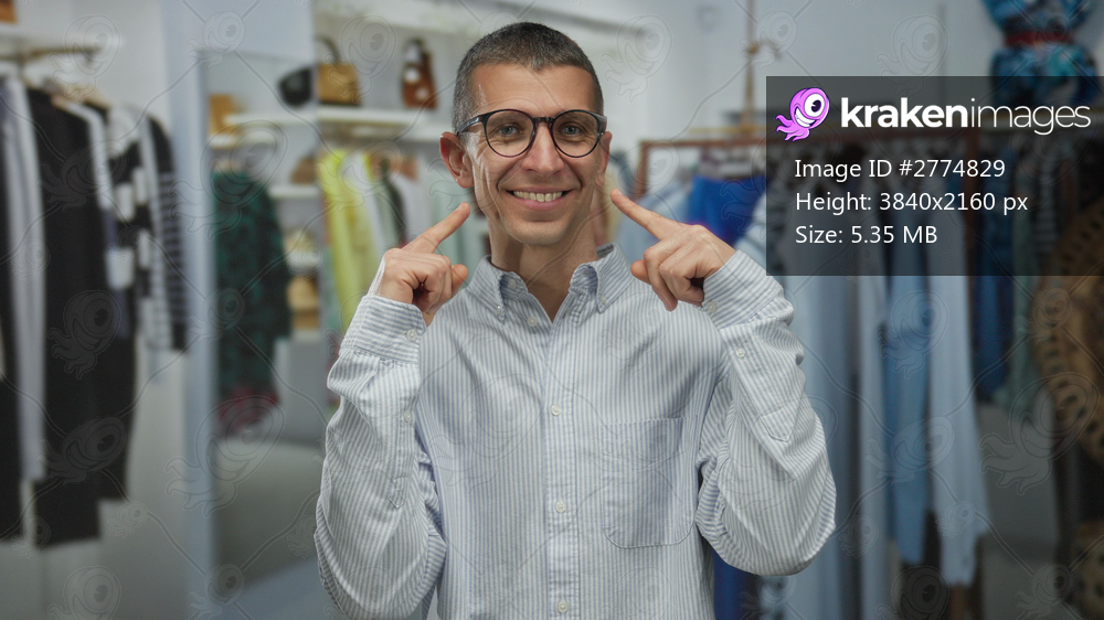 Smiling man in a clothing store pointing to his smile surrounded by racks of colorful clothes indoors.