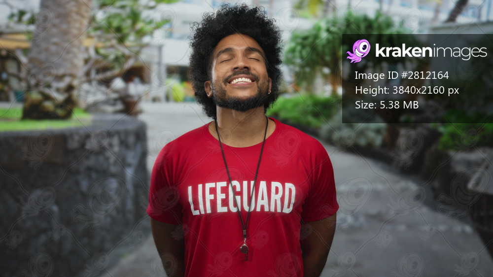 Smiling man in a red lifeguard shirt stands outdoors in a city street with greenery.