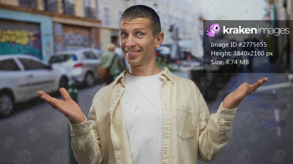 Smiling man in beige shirt on urban street with colorful graffiti and parked cars exuding positivity in outdoor setting.