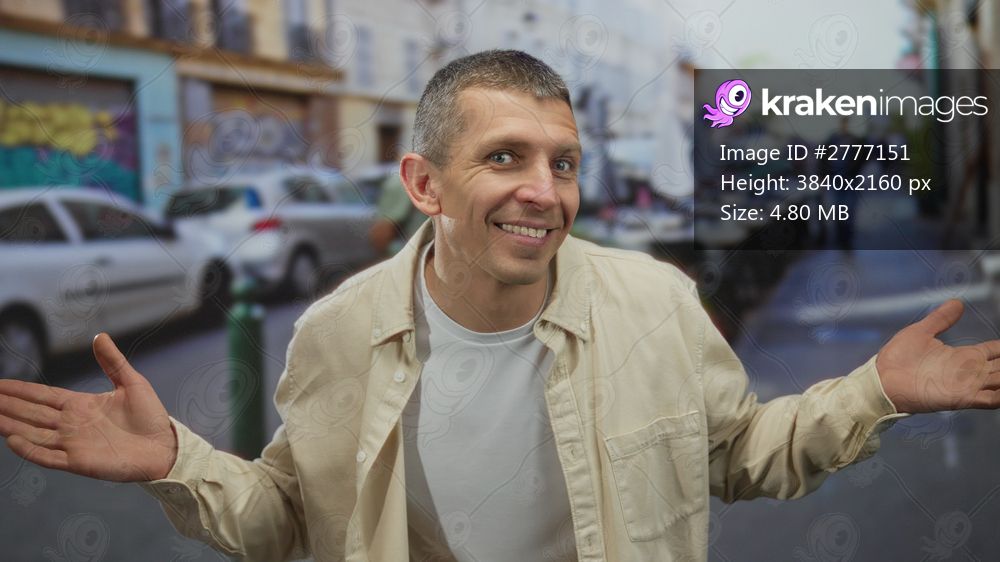 Smiling man in beige shirt on urban street with colorful graffiti and parked cars exuding positivity in outdoor setting.