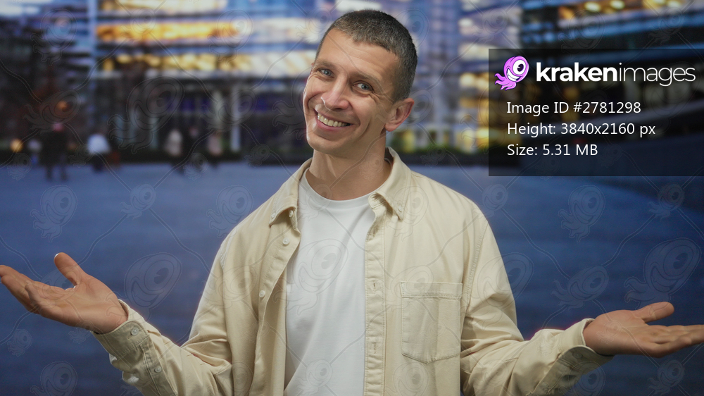 Smiling man in casual attire gesturing outdoors on a nighttime street illuminated by city lights against a modern urban backdrop showcasing a lively atmosphere. - Kraken Images