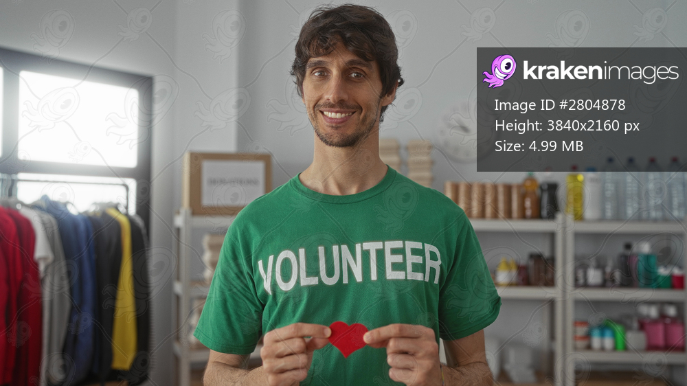 Smiling man in green volunteer shirt holds red paper heart with both hands in donation building; compassion kindness charity.