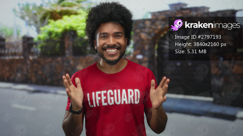 Smiling man in lifeguard shirt outdoors near stone wall, showing joy and enthusiasm.