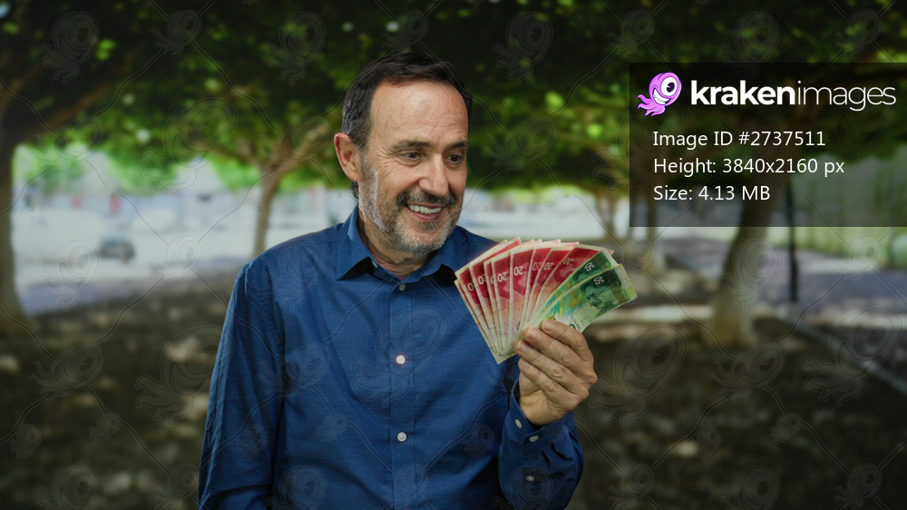Smiling man in park holds israeli shekel banknotes showcasing vibrant currency outdoors.
