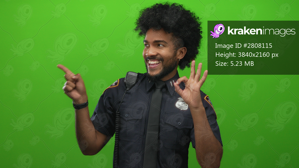 Smiling man in police uniform with green background showing okay sign and pointing, creating a positive, cheerful atmosphere.