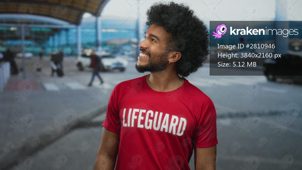 Smiling man in red shirt labeled lifeguard standing at an outdoor airport terminal, personifies upbeat energy amongst the bustling transportation backdrop. - Kraken Images