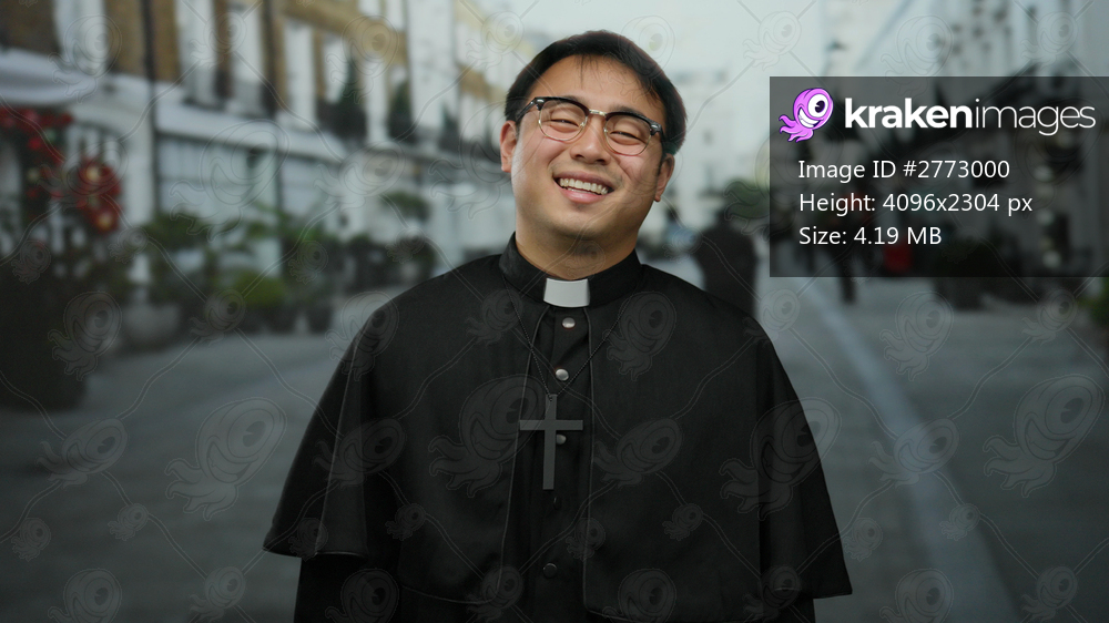 Smiling man in religious attire stands on an urban street wearing glasses and a robe with a cross, suggesting a cultural and spiritual theme in a city setting. - Kraken Images