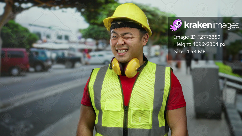 Smiling man in safety gear and hard hat stands confidently on a busy urban street showcasing construction professionalism amid city life.