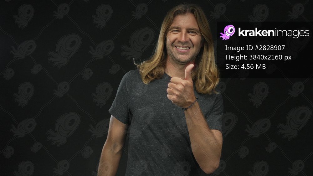Smiling man with long blond hair gives thumbs up in studio with black background and friendly gaze; optimism.