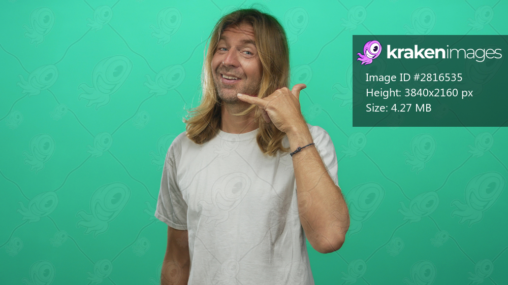 Smiling man with long blond hair in white shirt making call me gesture in green studio; friendly invitation.