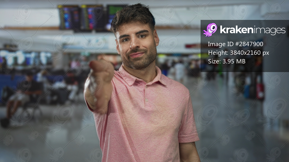 Smiling man offering handshake with extended hand at busy airport terminal; warmth trust connection journey.