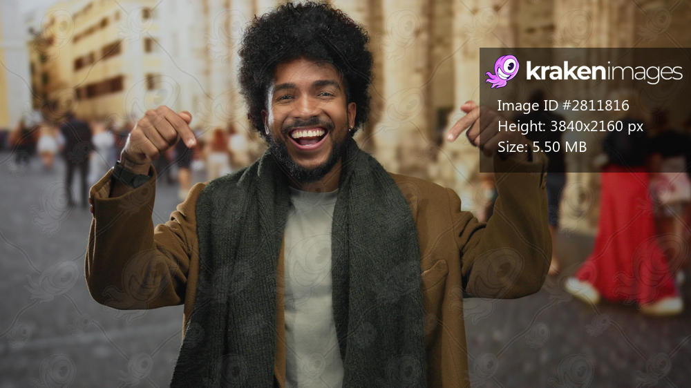 Smiling man outdoors wearing scarf and jacket points to ground with both hands amidst busy city street scene background.