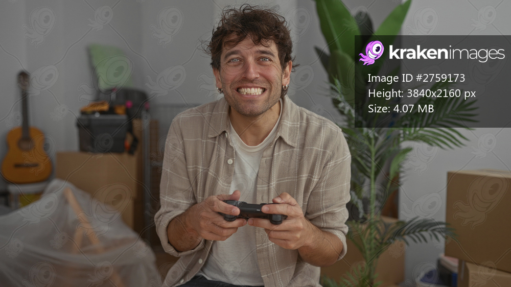 Smiling man playing video game in new home surrounded by cardboard boxes and plants illustrating moving and leisure in casual setting