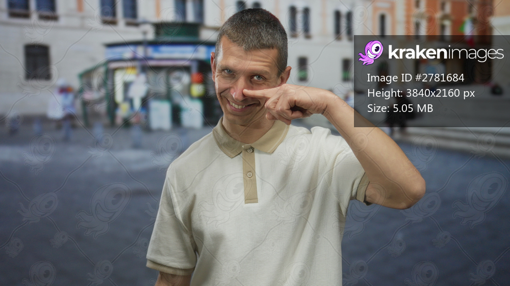 Smiling man pointing at nose outdoors on street in casual shirt against urban background.