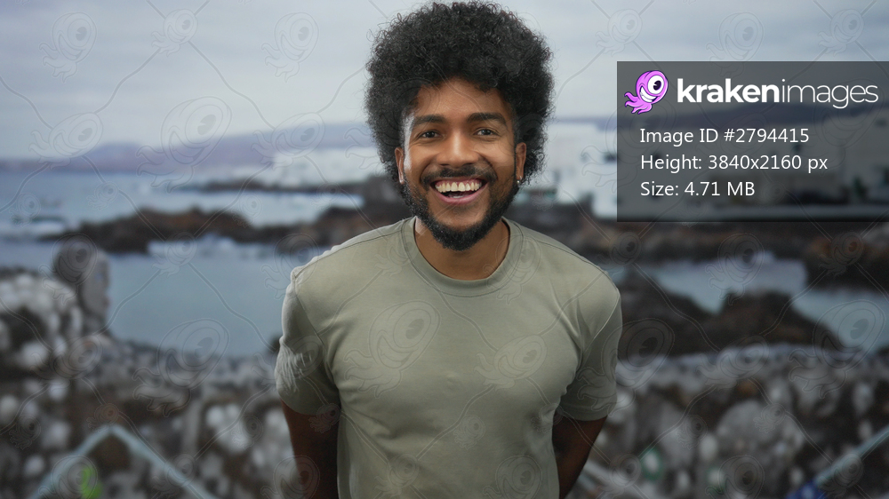Smiling man pointing cheerfully with a seaside promenade in the background, capturing a vibrant outdoor scene with ocean and coastal elements.