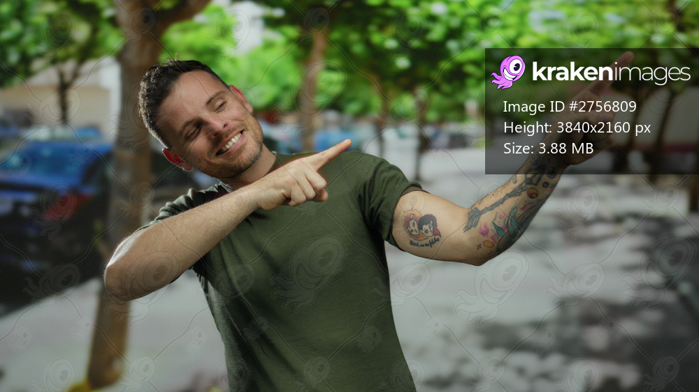 Smiling man points in street surrounded by cars and trees displaying tattoos and wearing green shirt in urban setting under bright sunlight creating vibrant lively atmosphere - Kraken Images