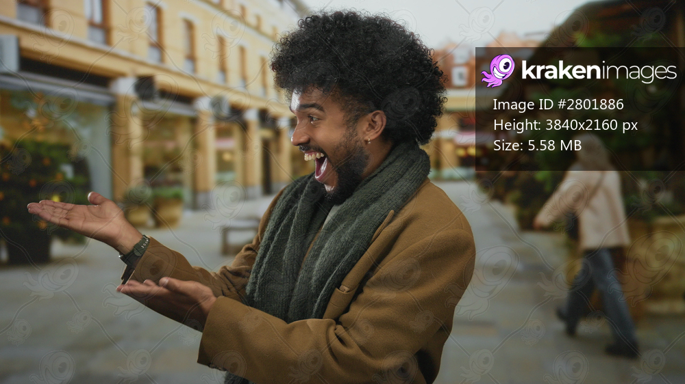 Smiling man presents something in a vibrant outdoor city street, showcasing joy and excitement surrounded by urban architecture and greenery.