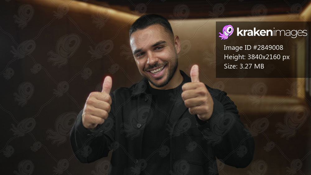 Smiling man shows double thumbs up in studio with warm light on smooth walls; happiness confidence motivation.