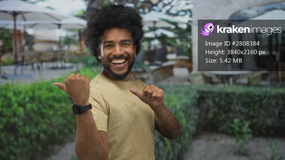 Smiling man with smart watch on terrace, pointing thumbs backward, surrounded by green bushes and umbrellas, captures the essence of outdoor relaxation. - Kraken Images