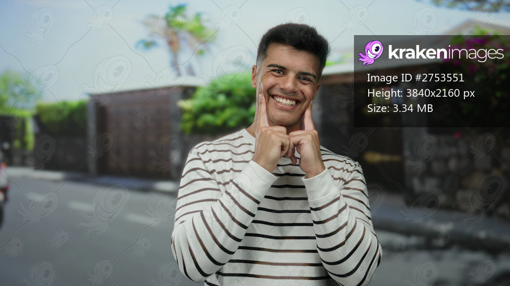 Smiling man standing on a sunny city street wearing a striped shirt with blurred motorcycle passing by vibrant foliage background outdoors
