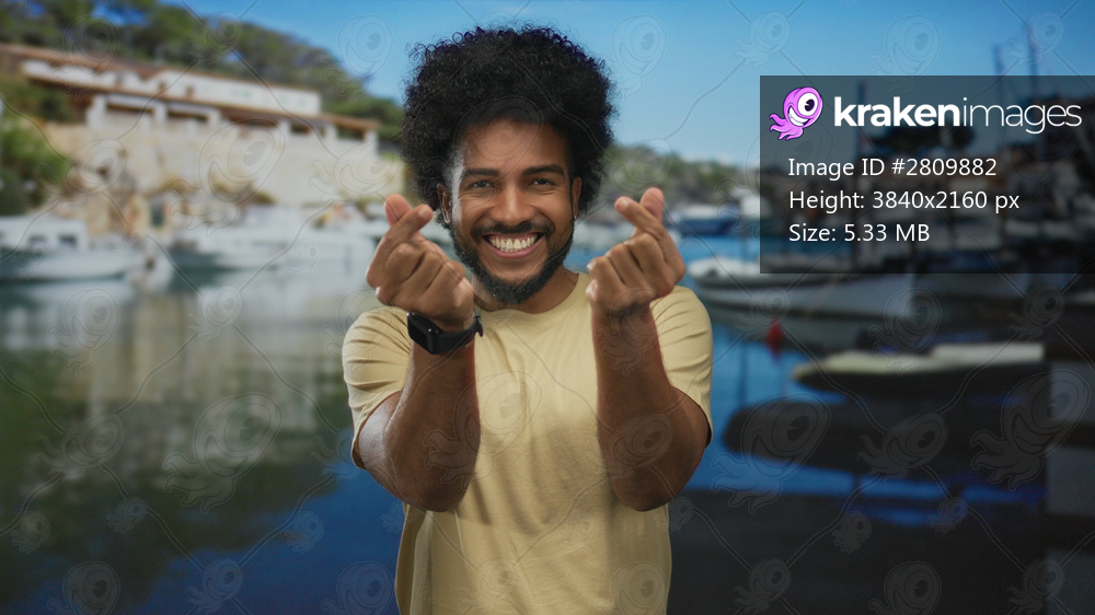 Smiling man standing outdoors at seaside port with boats in background on a sunny day wearing yellow shirt making heart gesture with hands