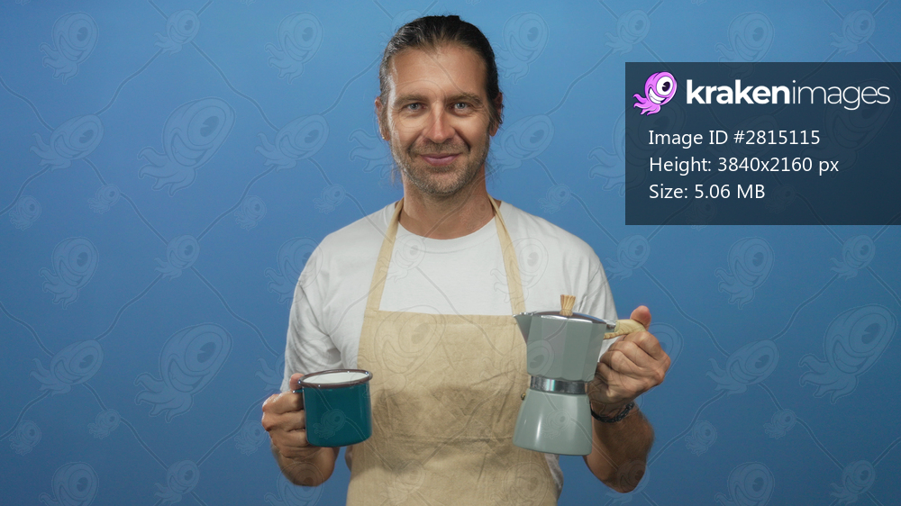 Smiling man wearing apron holding coffee mug and moka pot in a bright blue studio; morning comfort ritual.