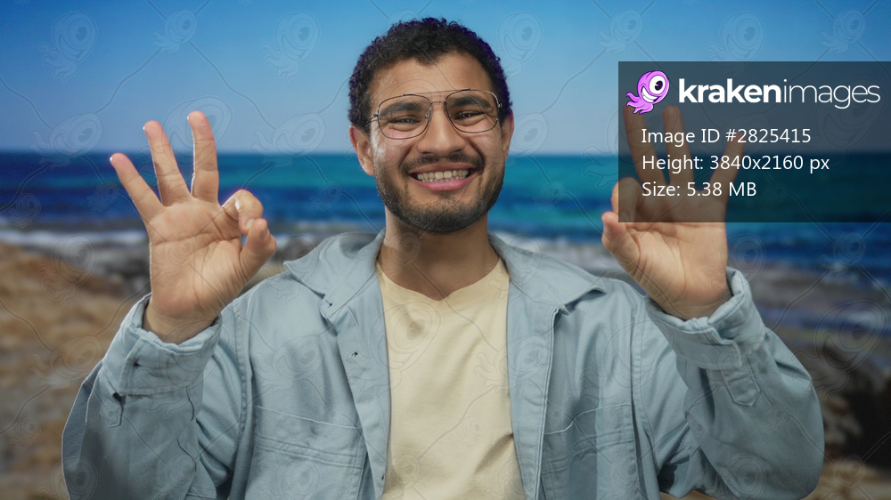 Smiling man wearing casual denim jacket and glasses with hands showing ok sign in a bright studio set; approval optimism.