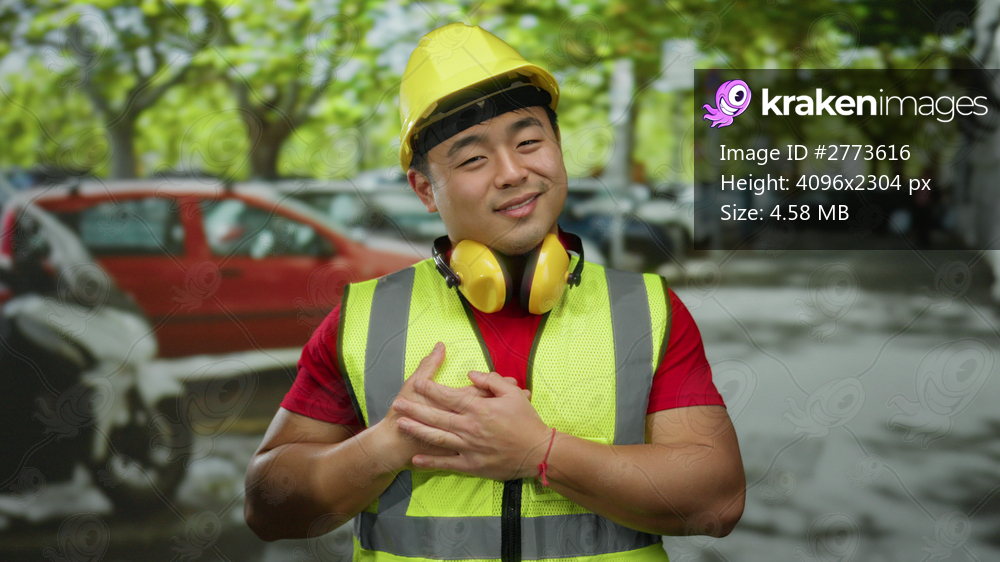 Smiling man wearing helmet expressing gratitude on busy urban street with cars in background on sunny day