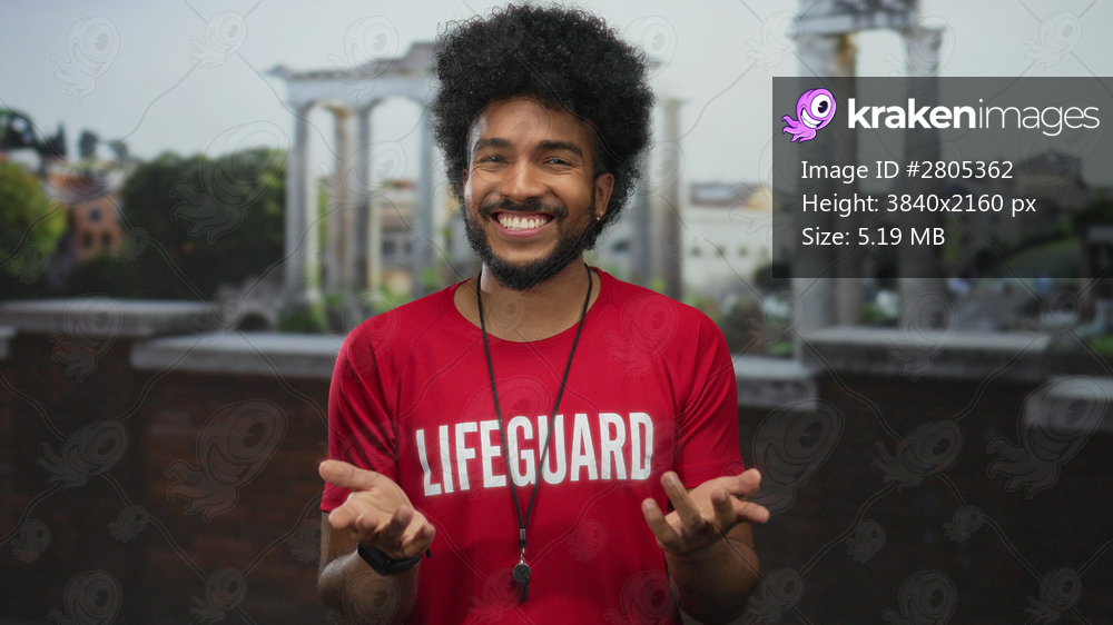 Smiling man wearing lifeguard shirt standing in front of roman ruins outdoors in city setting, blending ancient architecture with modern fashion and enthusiasm. - Kraken Images