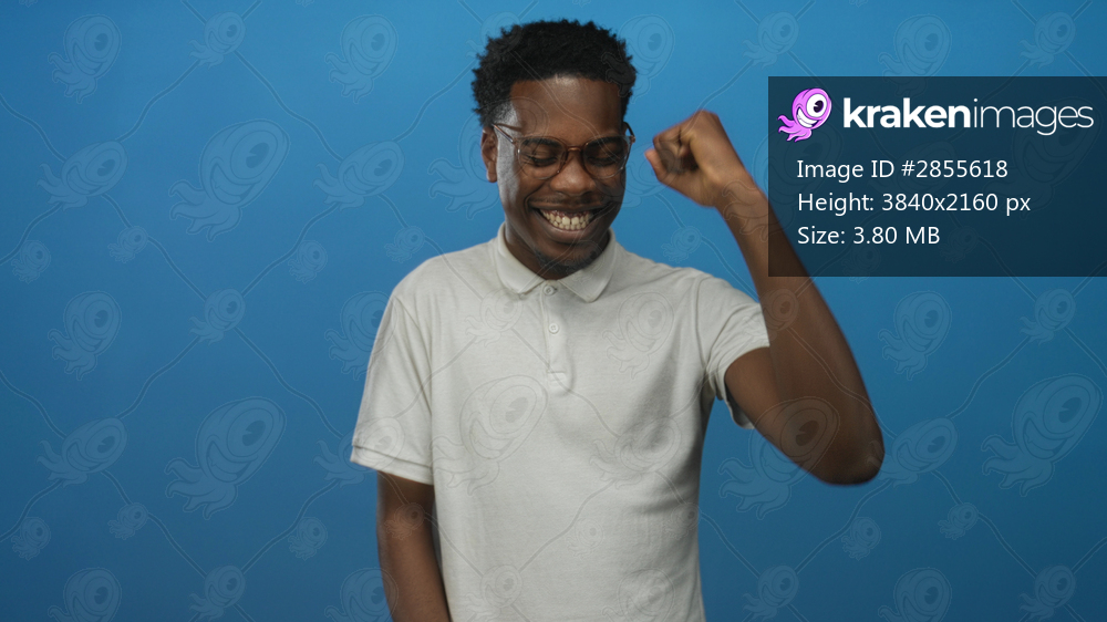 Smiling man wearing white polo shirt pumping fist in blue studio; success confidence achievement excitement.