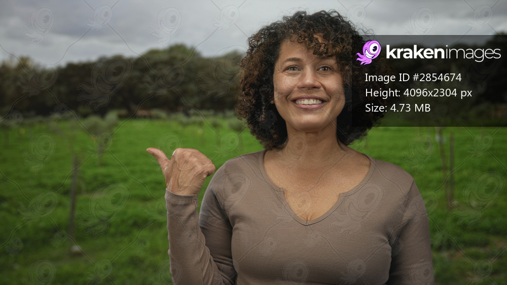 Smiling middle age hispanic woman pointing thumb to lush green forest clearing outdoors; quiet reflection.