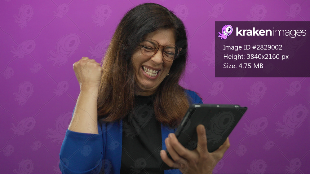 Smiling middle aged hispanic woman holding and tapping tablet in purple studio; excitement empowerment.