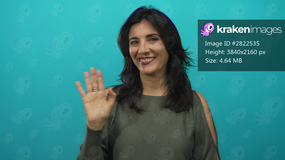 Smiling middle aged hispanic woman waving hand in studio against teal background; friendly greeting.