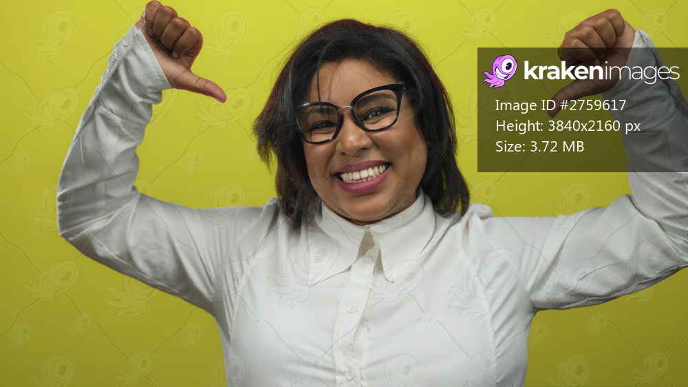 Smiling plus-size hispanic woman points to herself against a vibrant yellow background, exuding confidence and energy in a white shirt.