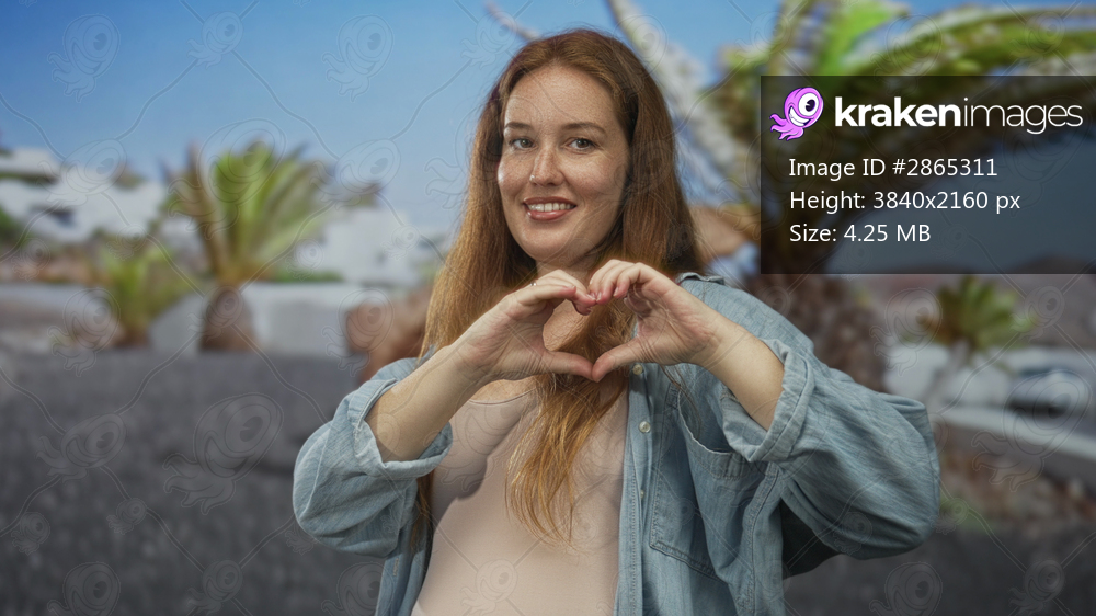 Smiling red haired woman wearing denim shirt hands forming heart gesture on daytime street; affection bond.